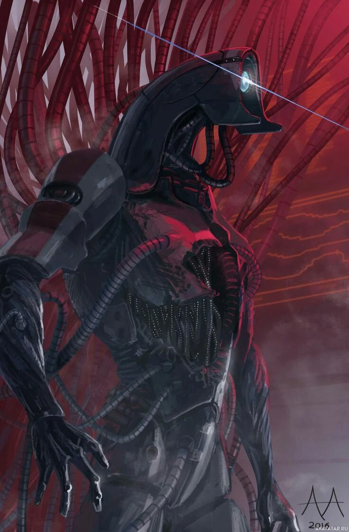 video game series. This character is likely a member of an advanced race known as the Turians, which are known for their technologically enhanced bodies and