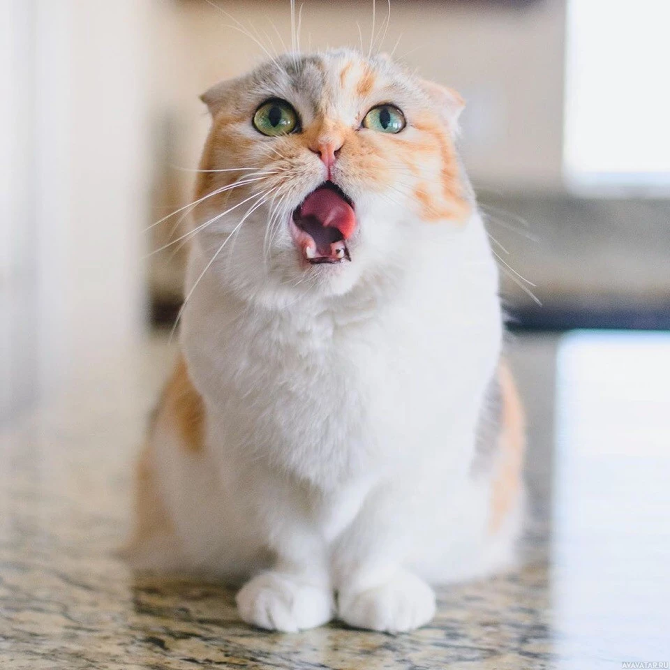 На снимке изображена кошка с широко открытым ртом, которая либо зевает, либо громко мяукает. Он имеет яркие зеленые глаза и сидит на кухонной столешнице. Шерсть кошки выглядит мягкой и ухоженной.