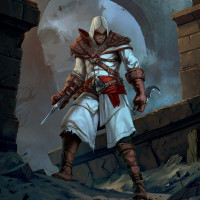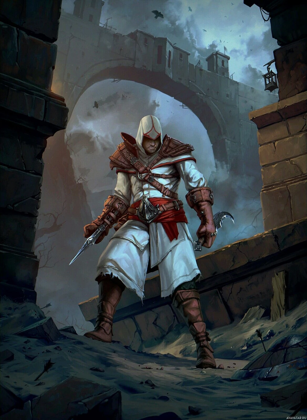 red accents, which is characteristic of the Assassins from the game. He is holding a sword and has a hood on his head, which also contributes to his assassin-like appearance. The background appears to be a ruined cityscape, possibly indicating a scene from one of