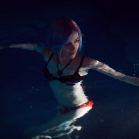 an indoor pool. The individual appears to have a blue-hued hair style and is wearing what seems to be a dark-colored top with white or light-reflective elements that could be part of a swimsuit. They are reaching out towards the water, possibly for balance or just for