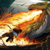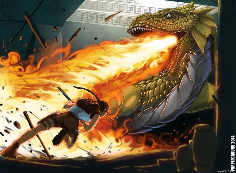 breathing fire at Lara Croft, who seems to be dodging or deflecting the flames with her bow. The setting looks like it could be from an adventure game, possibly featuring fantastical elements such as
