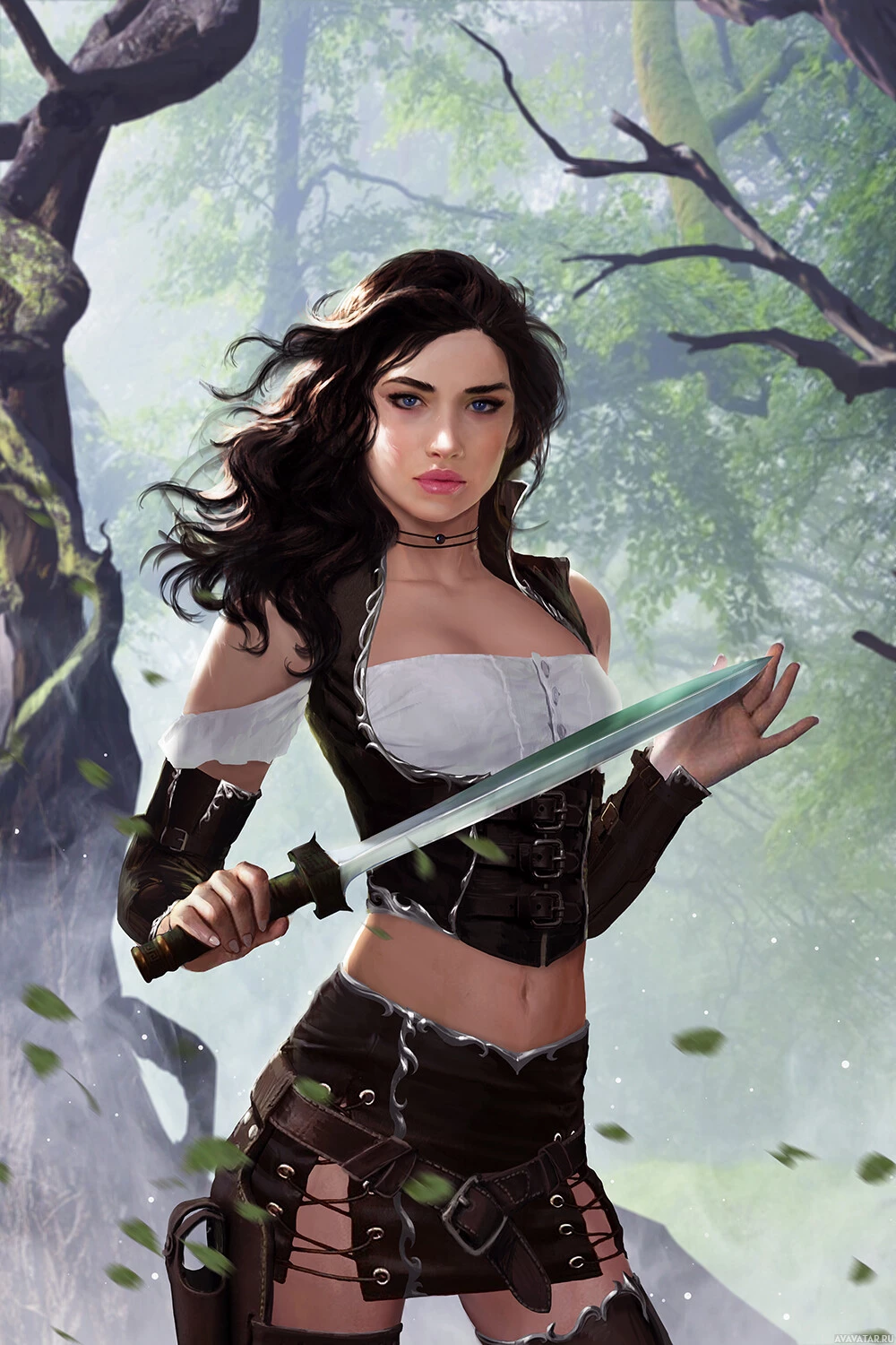 Картинка показывает женский персонаж, который, кажется, из фэнтези или видеоигры. У нее темные волосы и она носит доспехи с мечом в правой руке, предполагая, что она может быть воином или искателем приключений. Фон включает в себя природные элементы, такие как деревья и то, что кажется туманом или низко висящими облаками, создавая мистическую атмосферу леса.