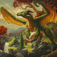 a serpentine body that suggests a powerful and majestic creature. In the background, there are hints of a forest or woodland area with