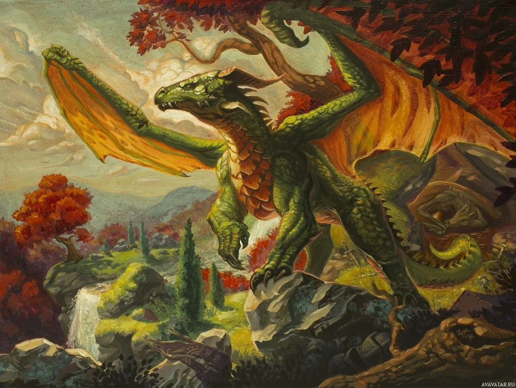 a fantasy scene featuring a large dragon in the foreground. The dragon is detailed, with scales of green and brown hues, wings spread wide, and