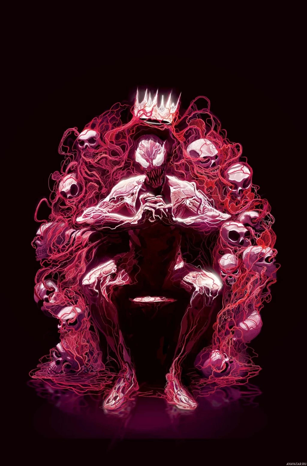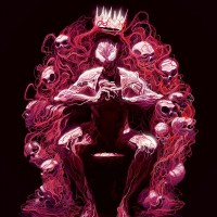 The image depicts an artistic representation of a throne. On the throne sits a figure that appears to be a humanoid with red, pink, and purple tones, resembling a carnage or destruction theme due to the surrounding elements. This figure is sitting in