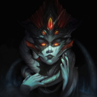 red eyes and a humanoid face with pointed ears, giving it a somewhat demonic appearance. Its skin seems to have scales, and it has
