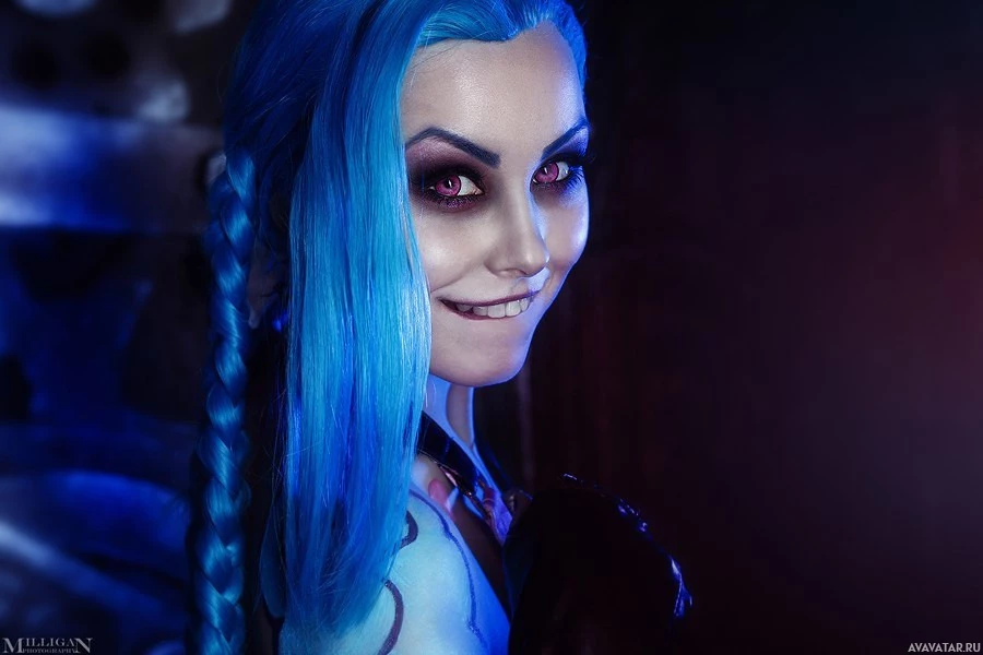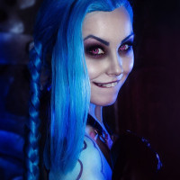 League of Legends" and is specifically styled to resemble Jinx, one of the characters in the game. The cosplayer has dyed their hair blue, which matches Jinx's signature look, and they are wearing makeup that accentuates the character's distinctive