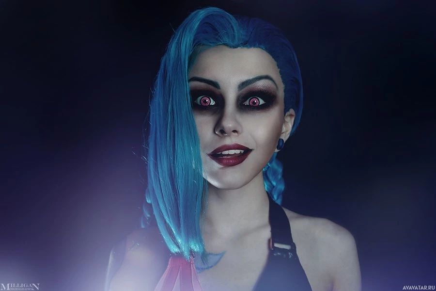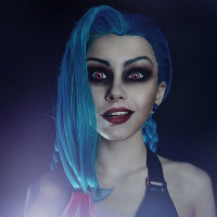 blue hair and makeup that enhances their character's look. They are wearing clothing that appears to be inspired by Jinx's style in the game, with red elements that stand out against a darker background. It seems like they are posing for this photo as part of a cosplay event or simply enjoying the experience of dressing up as their