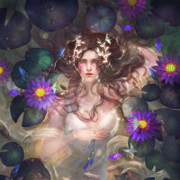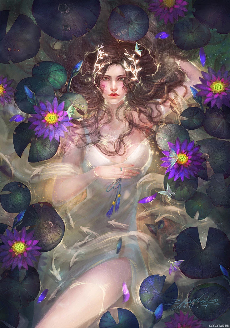 purple flowers and green plants that are likely waterlilies, which are common in ponds and lakes. Her expression is serene, and she has an ethereal quality due to