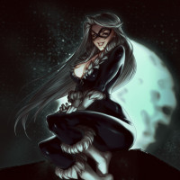 a full moon behind her. She is styled in a way that evokes the appearance of a classic superheroine, often referred to as a "
