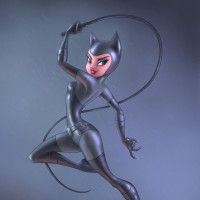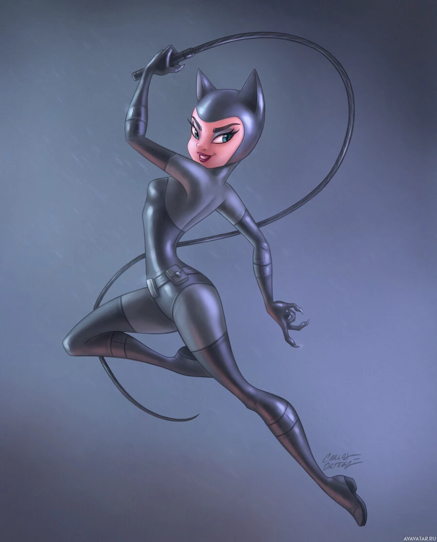 На картинке изображен анимированный персонаж, известный как Кэт Нуар из телевизионного шоу «Девушки-супергерои DC». Он изображен в форме супергероя, в черном костюме с капюшоном и с кнутом. Фон предполагает темную или ночную обстановку, что характерно для таких персонажей, которые часто работают в такой среде.