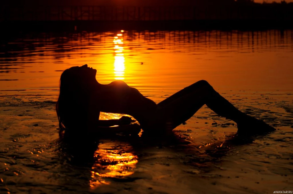 На картинке изображен силуэт девушки, лежащей на спине на мелководье. Она появляется на пляже во время заката, о чем свидетельствует теплое свечение заходящего солнца. Небо окрашено оттенками оранжевого и желтого, отражаясь от поверхности воды. Это безмятежная сцена, которая отражает спокойствие момента.
