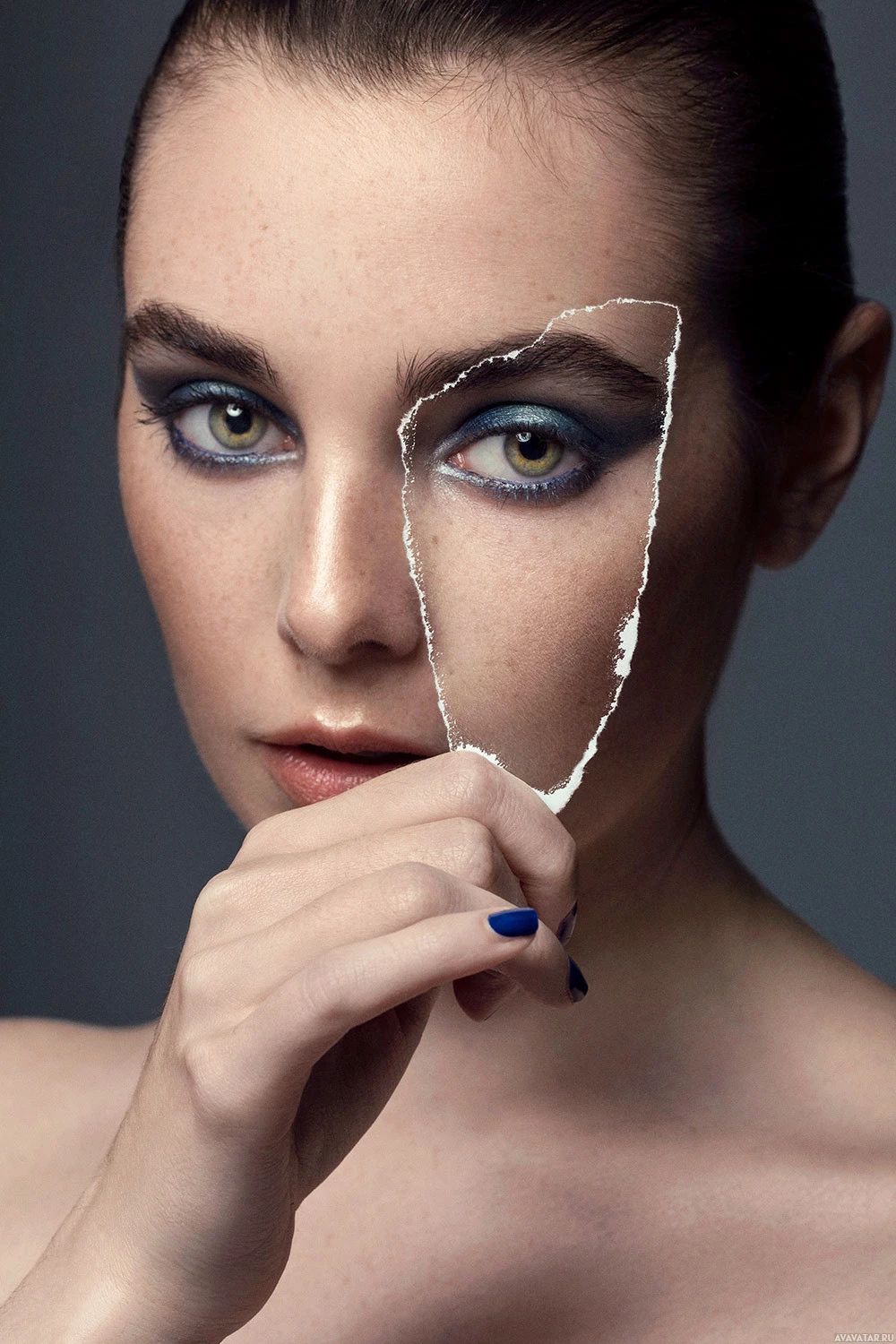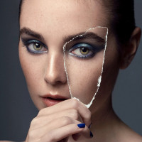 own face. There is an artistic overlay or mask that covers one side of her face, creating a split look between two