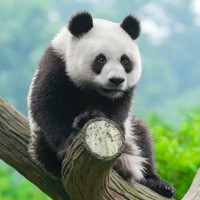 a tree branch. It appears to be a digitally altered or photoshopped picture, as pandas do not naturally sit in such a human-like posture with one hand supporting