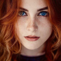 На картинке изображена молодая женщина с яркими рыжими волосами. Она имеет голубые глаза и смотрит прямо в камеру, создавая сильную связь со зрителем. Ее выражение кажется созерцательным или интроспективным. Освещение на фотографии подчеркивает ее особенности и добавляет к общему драматическому эффекту портрета.