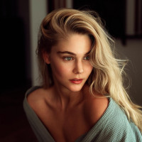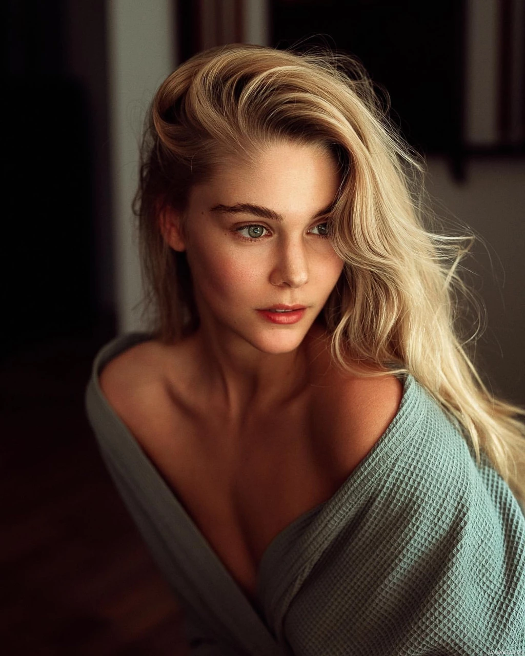 На снимке изображена молодая женщина с светлыми волосами и голубыми глазами. Она кажется в помещении, возможно, в элегантной обстановке, учитывая ее наряд и окружающее освещение. Ее поза расслабленная, но уравновешенная, и она, кажется, смотрит прямо в камеру с нежным выражением лица.