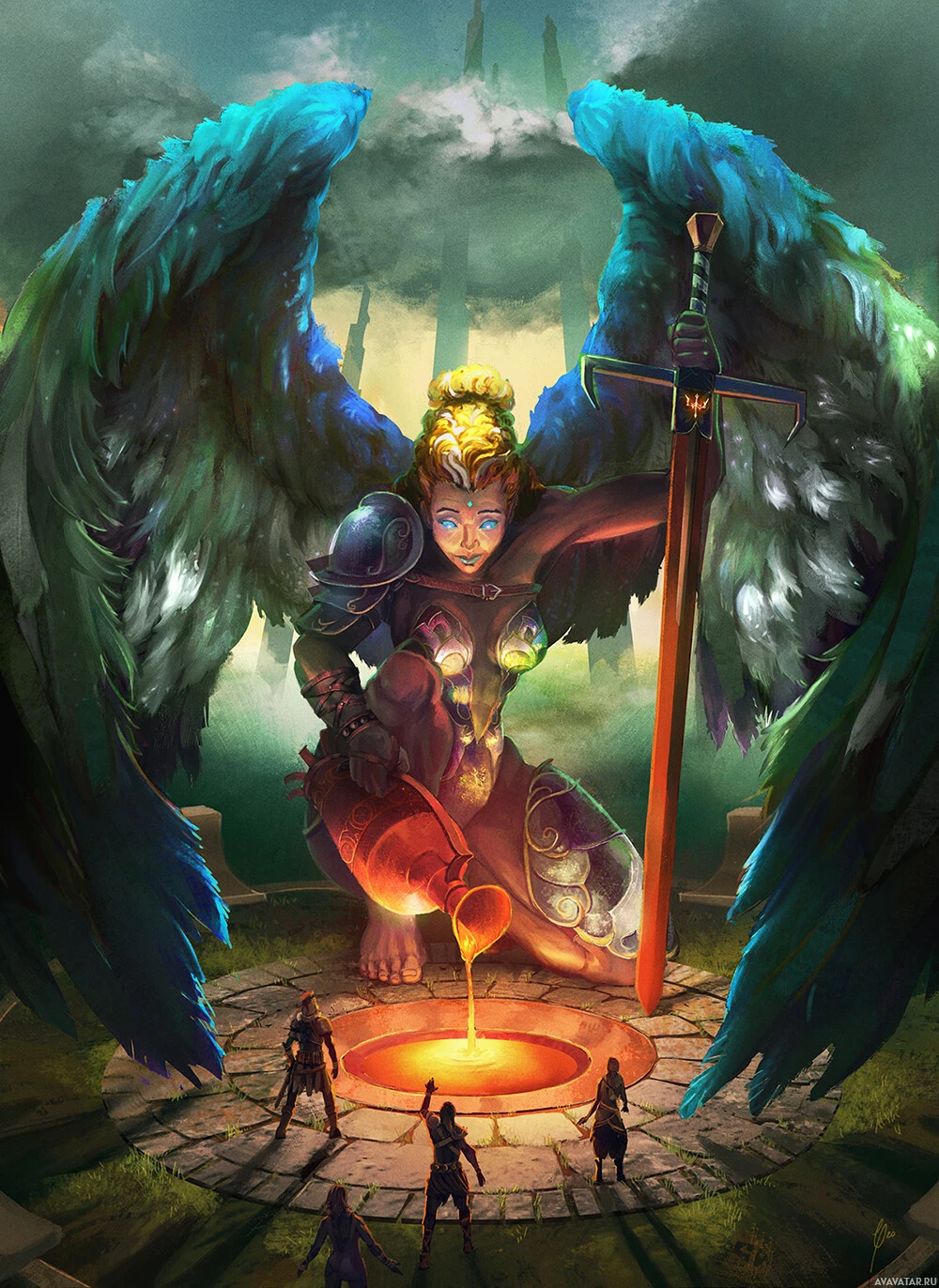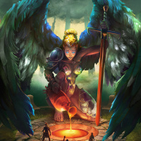 an angelic figure in the center, holding what appears to be a sword and wearing armor with wings that resemble those of a bird or possibly a demon. The figure is surrounded by a group of small, humanoid figures who seem to be bowing down or showing respect to