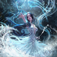a blue energy that flows into the young woman's hand. The background is dark and mysterious, enhancing the supernatural or otherworldly atmosphere of the image.