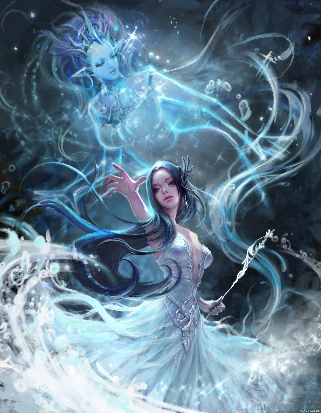 a young woman with flowing blue hair and wearing an elegant, ethereal dress that could be interpreted as a ballerina or mermaid-like attire. She is dancing in the air, reaching out towards something magical or supernatural in nature. The other character resembles a ghostly figure with a pale complexion,