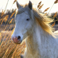 a white horse standing in what appears to be a natural, rural setting during sunset or early evening. The horse has its eyes closed and is blowing through its mane, suggesting movement. There are