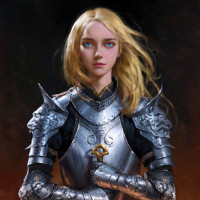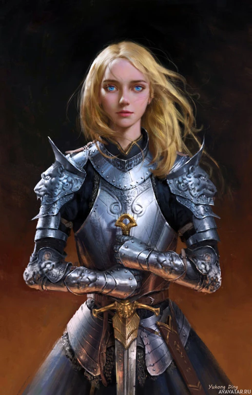 a female warrior with blonde hair. She is wearing armor, including a breastplate and shoulder guards, and holds a sword at her side. Her expression is serious or contemplative. The artwork suggests a fantasy or historical context.