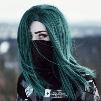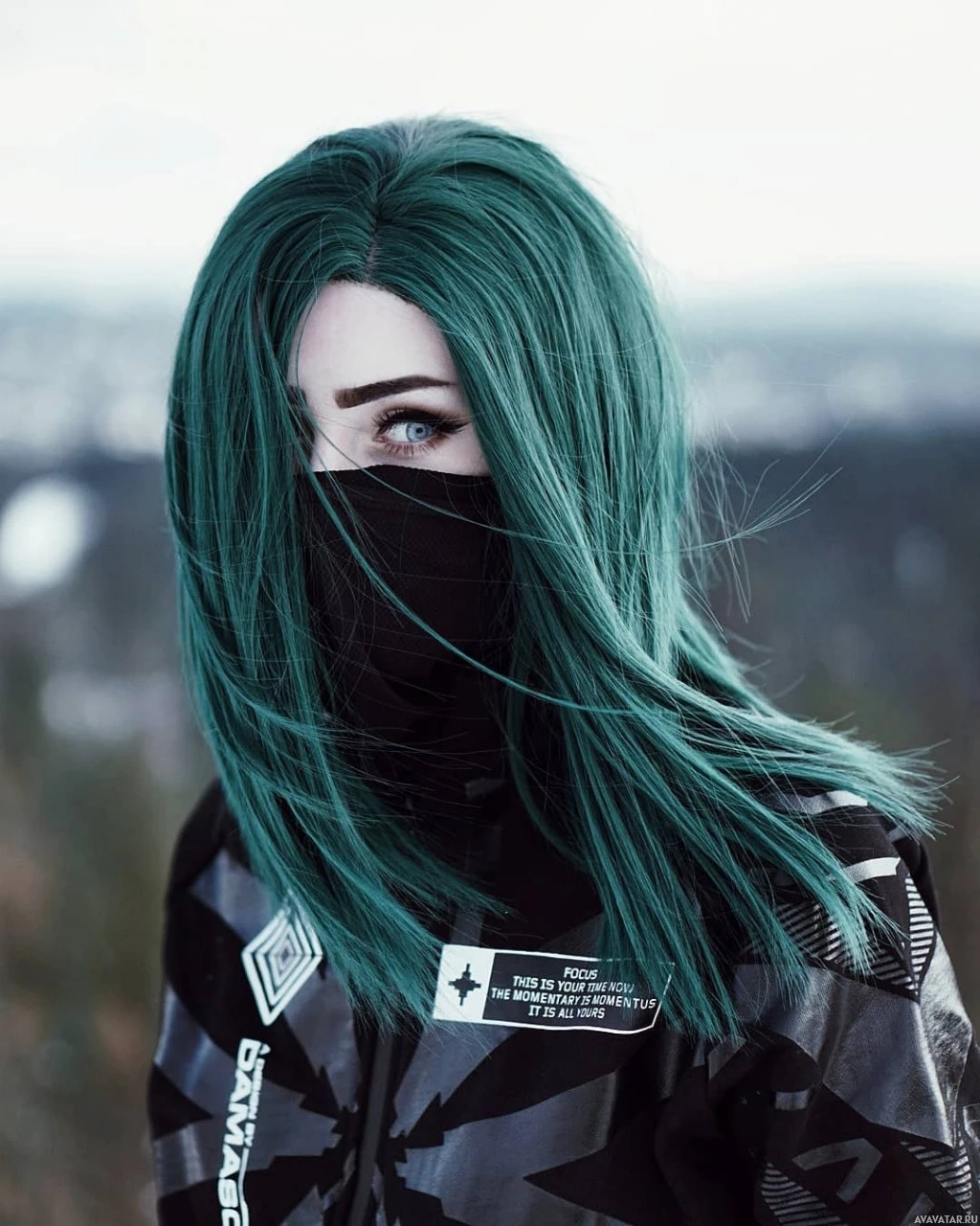green hair and they are wearing what appears to be protective gear, including a mask. The individual is also wearing a jacket with some