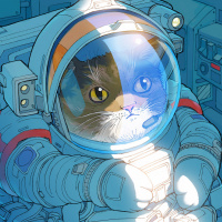 На снимке изображена кошка в костюме астронавта и шлеме. Похоже, что он находится в пространственной среде, предполагая причудливую или фантастическую обстановку, где кошки антропоморфизируются с человеческими характеристиками, такими как обучение астронавтов. Кошка смотрит из козырька шлема костюма, придавая ему вид удивления или любопытства.
