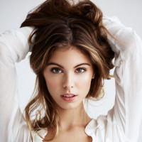 The image shows a woman posing for the camera. She is wearing a blouse with an unbuttoned top, and her hair is styled in