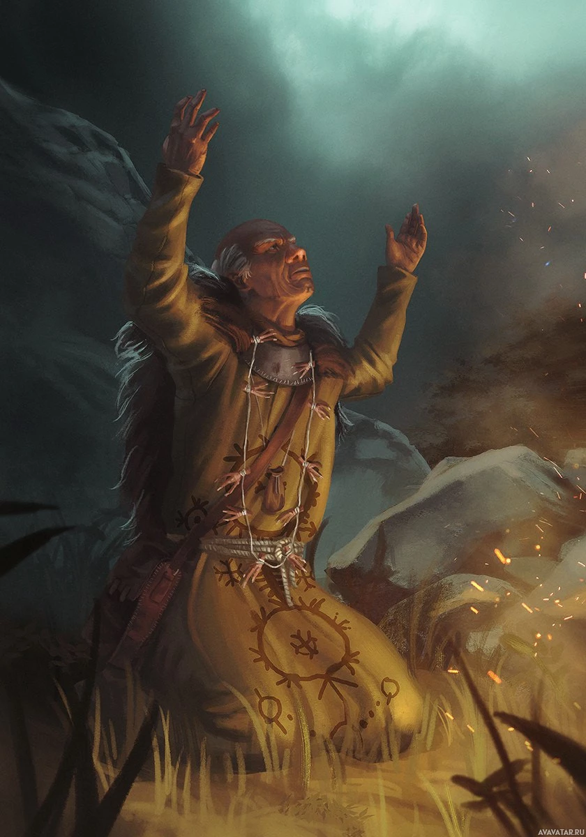 monster hunter, and can be seen in a moment of prayer or supplication, with hands raised to the sky. The setting appears to be outdoors at night, likely in a natural environment typical of