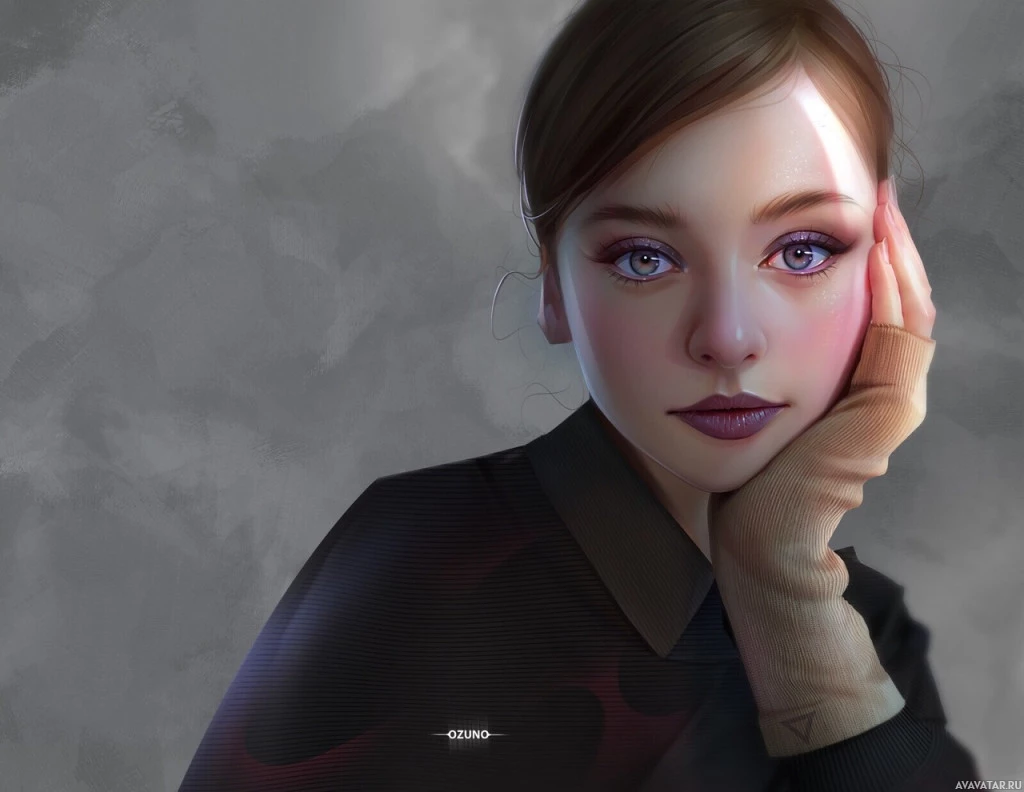 a young woman with a thoughtful expression. Her eyes are looking slightly away from the viewer, and she has her hand on her chin, which suggests contemplation or
