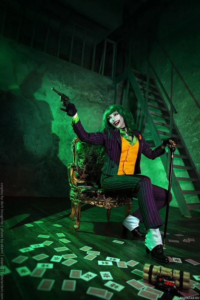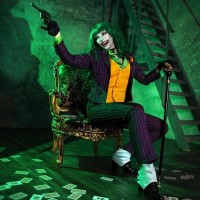 an elaborate costume, which appears to be inspired by the character of the Joker from the Batman series. This individual is seated and holding