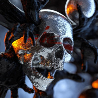 ominous tone, which may suggest an eerie or macabre theme. The skulls are intricately designed with patterns that could be inspired by insects or bones.