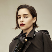 dark makeup, particularly on her lips and around her eyes, which gives her a striking appearance. Her hair is short and styled with bangs that frame her face. She's dressed in what appears to be