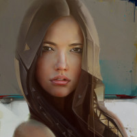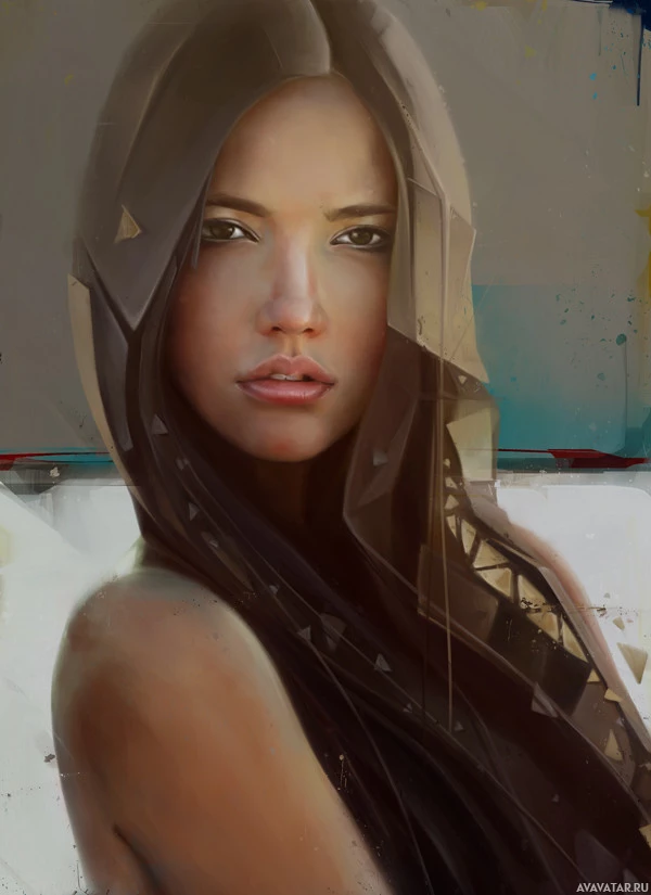 a neutral expression on her face and is looking directly at the viewer. Her attire appears to be casual, suggesting a relaxed or informal setting. The style of the artwork suggests it could be a digital