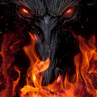The image depicts a fantasy-themed scene featuring what appears to be a demon. The creature is shown with its head emerging from the flames, giving it an intimidating and fierce appearance. It has sharp teeth and