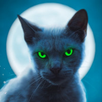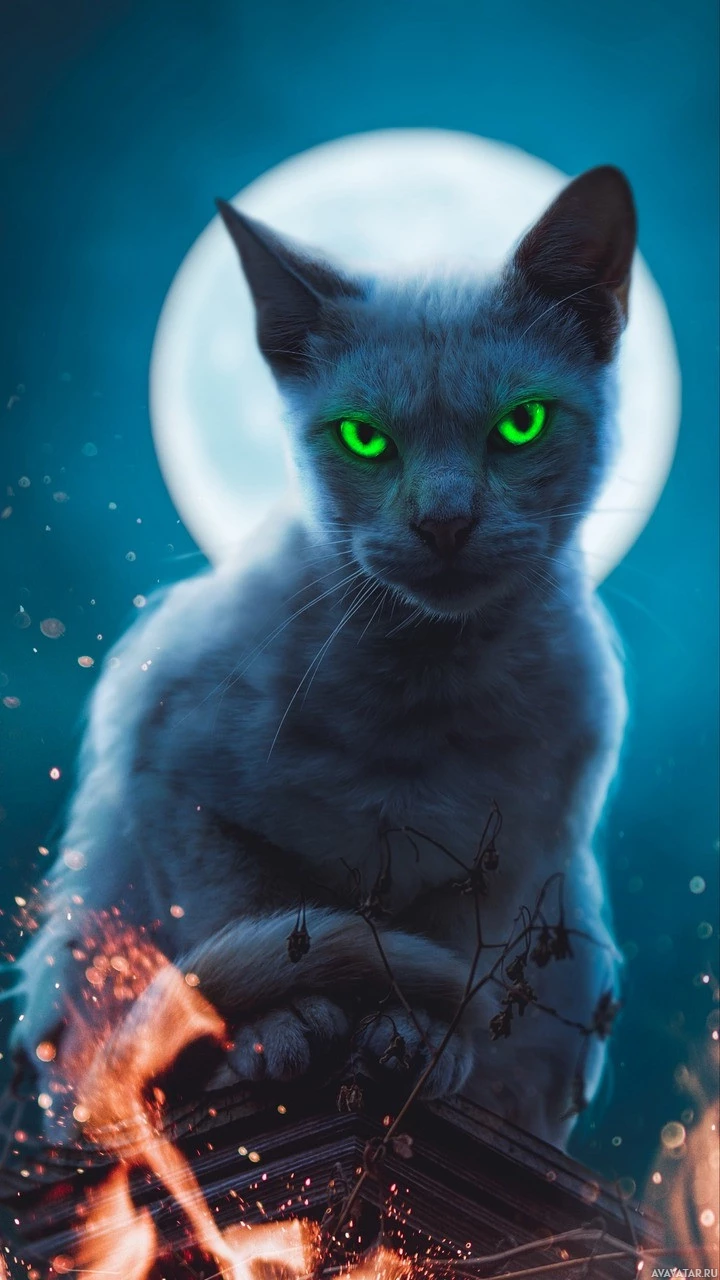 green eyes. It appears to be sitting on a surface with what looks like flames or sparks around it, suggesting a magical or mystical atmosphere. In the background, there is a large