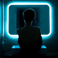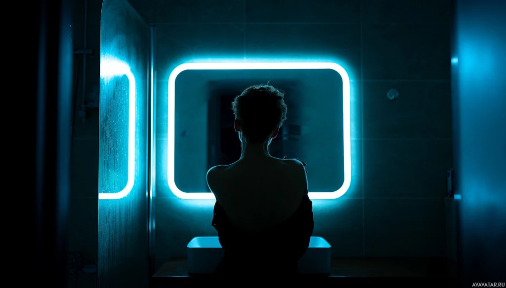 The image shows a person sitting in front of a mirror with illuminated, glowing