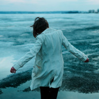 a body of water. The individual is facing away from the camera and towards the water, with arms outstretched or widespread, possibly as if they are embracing the environment or celebrating their arrival at