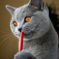yellow eyes. The cat appears to be holding a pencil in its mouth, as if it's "writing" or playing with it. This is a digitally altered photo meant to be humorous, showing the cat in a human-like pose and activity.