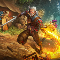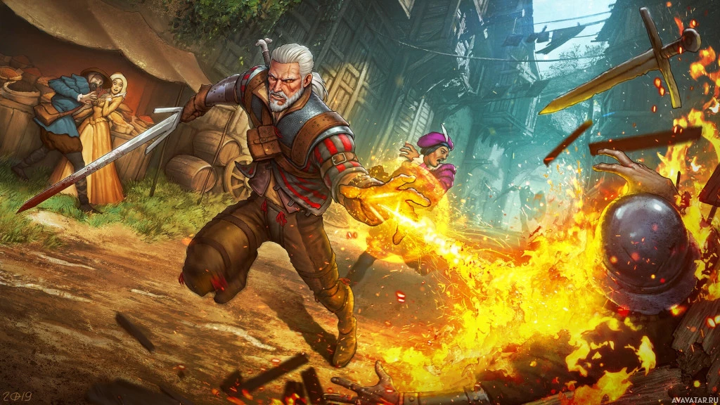 Geralt of Rivia, who is a witcher, a monster hunter from a fictional universe. He's shown in his