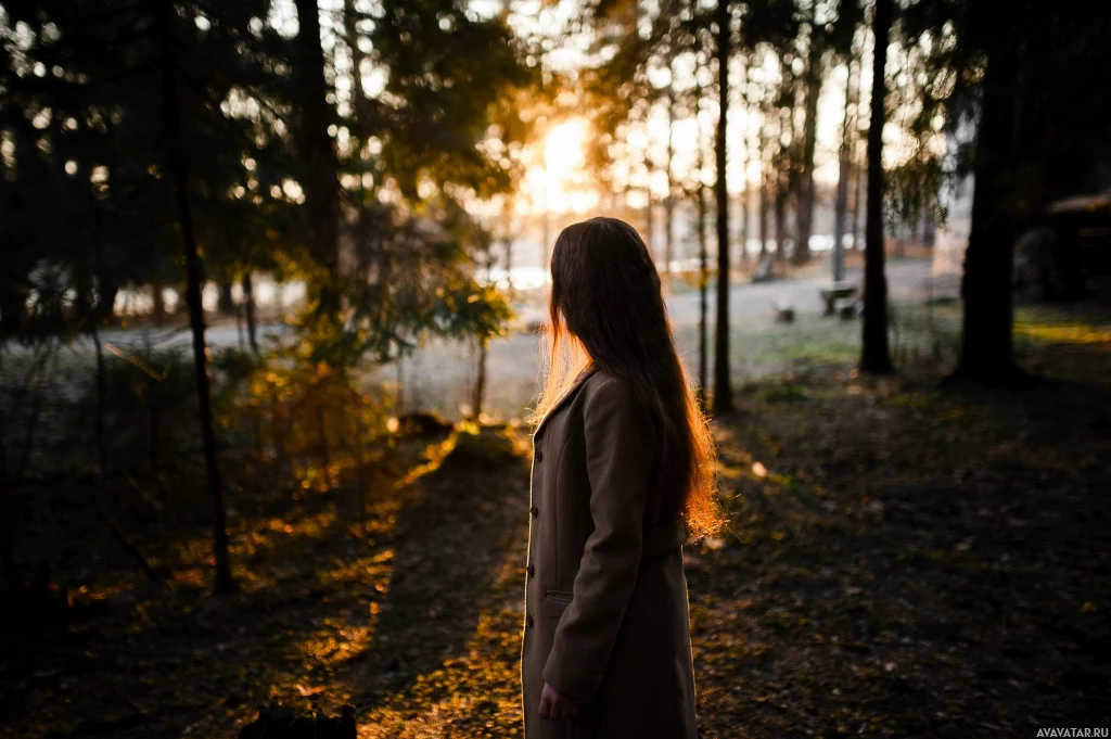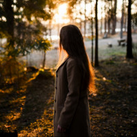 an outdoor setting, possibly a forest or wooded area. The individual is facing away from the camera with their back towards us. It looks like the sun might be low in the sky, which could indicate either sunrise or sunset. The lighting suggests that the sun is behind the person, creating