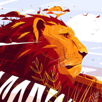 The image features a stylized illustration of a lion with a detailed mane, set against