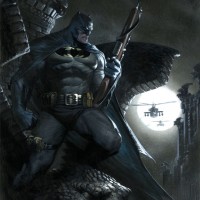comic books and other media. He is depicted holding a gun while sitting on a ledge at night under