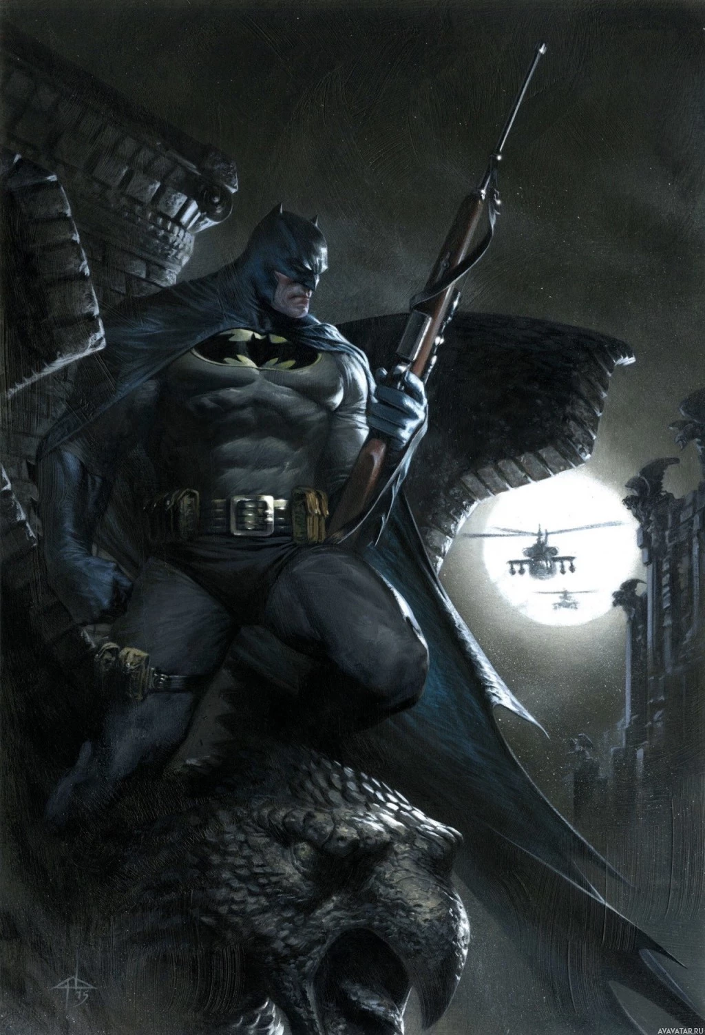 a full moon, which suggests he might be surveying or preparing for an operation. The background includes elements such as a helicopter and what appears to be a bat-themed emblem, which is fitting considering his iconic