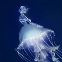 an underwater creature or mermaid. The background is deep blue, and the overall effect is ethereal and whimsical.