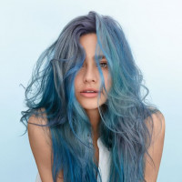 The image shows a person with blue hair. They appear to be a young adult woman with her hair styled in an unkempt, messy manner that adds to the artistic and modern vibe of the photo. The background is minimalistic, emphasizing the subject.