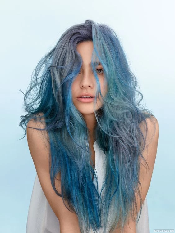 На снимке изображен человек с синими волосами. Они кажутся молодой взрослой женщиной с ее волосами, стилизованными в неопрятной, грязной манере, которая добавляет художественной и современной вибрации фотографии. Фон минималистичный, подчеркивающий предмет.
