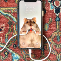 a humorous effect as if the hamster is taking a selfie. Additionally, there are wires connected to the smartphone, likely for charging purposes.