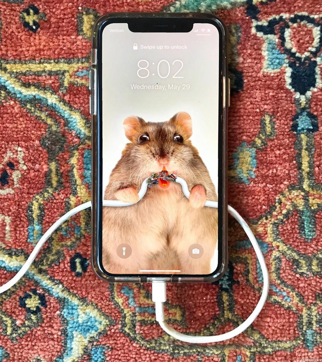 The image shows a smartphone lying on its side with the screen displaying an amusing picture of a hamster wearing a pair of sunglasses and sitting in a wheel, which is likely meant to mimic