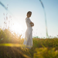 The image shows a person standing in an open field with tall grass during what appears to be either dawn or dusk, given the soft lighting and long shadows. The individual is facing away from the camera, looking towards the sunrise or sunset, which casts warm light on their back. There's a serene atmosphere to the scene.
